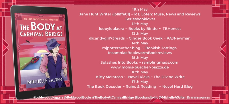 I am pleased to be welcoming Michelle Salter to Novel Kicks and the blog tour for her novel, The Body at Carnival Bridge – book three in the Iris Woodmore Mysteries series.